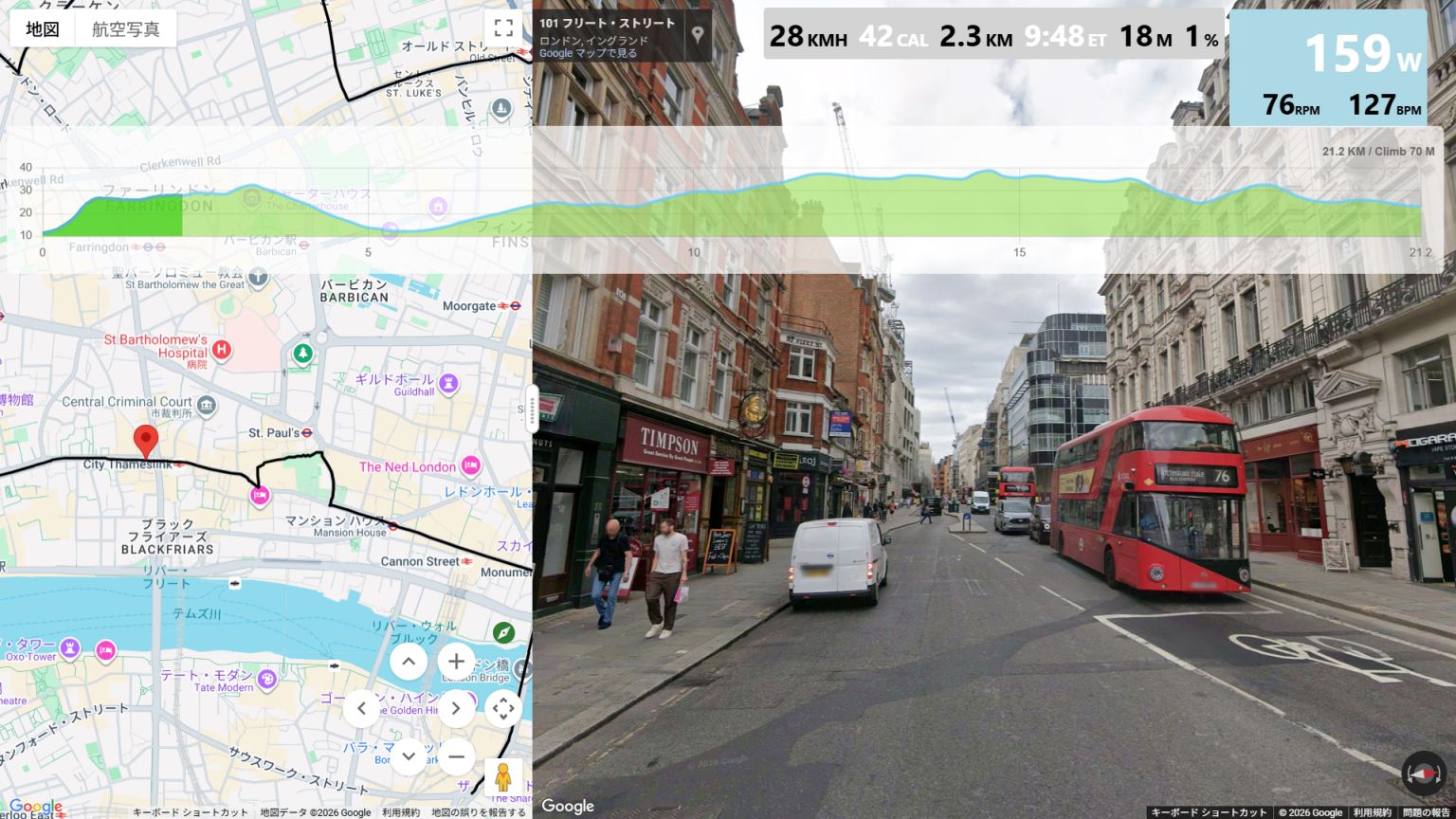 これは、ロンドンのバッキンガム宮殿の近くを仮想サイクリングしている時の画面です。画面左が現在地点を示す Googleマップ、右がその時の Google ストリートビューです。上部には速度、走行距離、走行時間、傾斜度、ワット数、ケイデンス、心拍数などの表示もあって、仮想サイクリングに必要な情報は一通りそろっています。