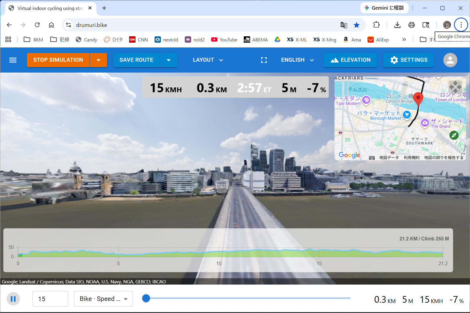 使っている仮想サイクリングソフトは drumuri.bike という Webベースで動作するソフトです。Ride with GPS を使って作成した走行ルートの GPS ファイルを drumuri.bike に読み込ませると、作成したルートに沿って仮想サイクリングができます。